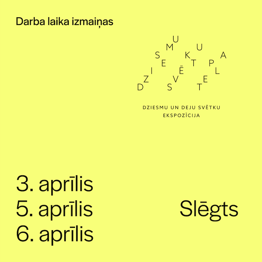 Informējam, ka ekspozīcija “Dziesmusvētku telpa” 3., 5. un 6. aprīlī būs slēgta.